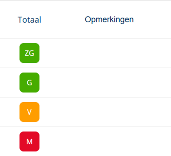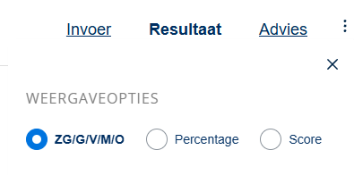 6. Het resultaat staat automatisch ingesteld op een ZG/G/V/M/O weergave. Je kunt deze weergave wijzigen naar een percentage of score door de 3 puntjes aan de rechterkant.