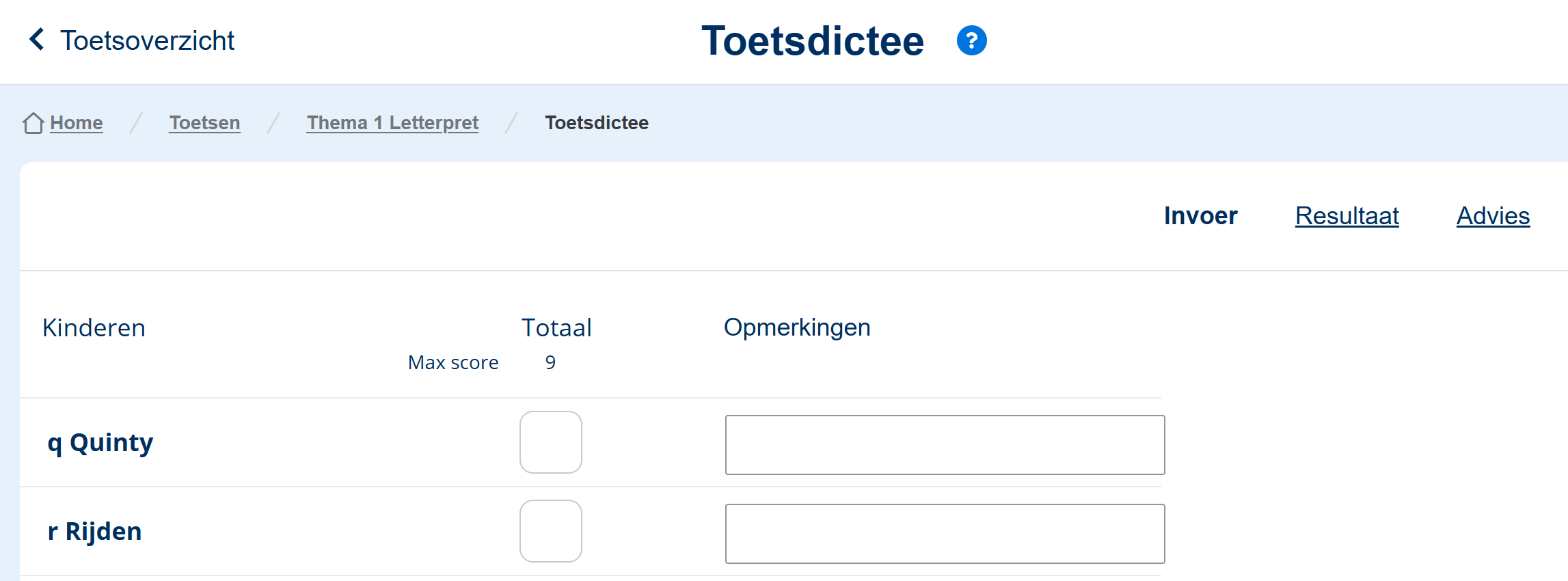 Na het afnemen van het toetsdictee, kun je de resultaten registreren. Heb je een koppeling met een leerlingvolgsysteem (LVS), zoals bijv. ParnasSys? Na het invoeren van de totaalscore worden de resultaten automatisch doorgestuurd naar het LVS.