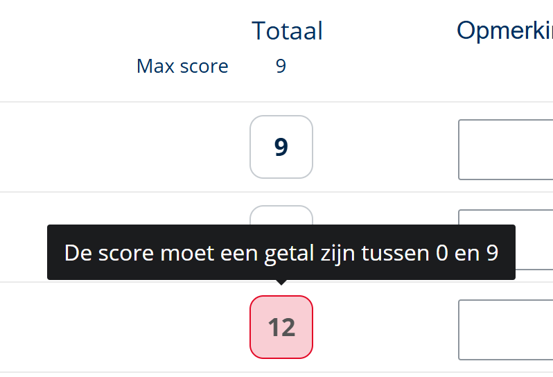 4. Bij het invoeren van een hoger getal dan het totaal, kleurt het vakje rood en wordt het resultaat niet opgeslagen.