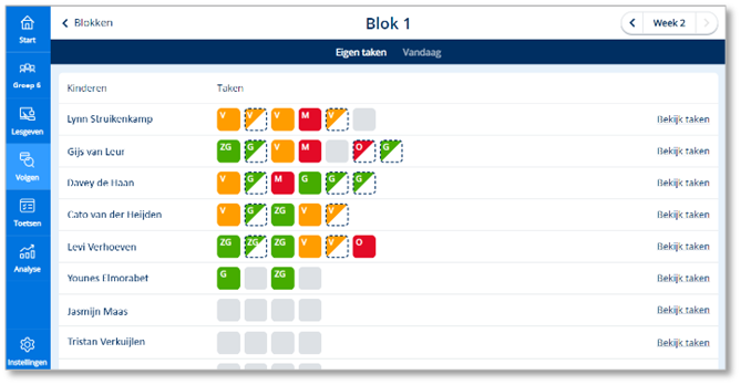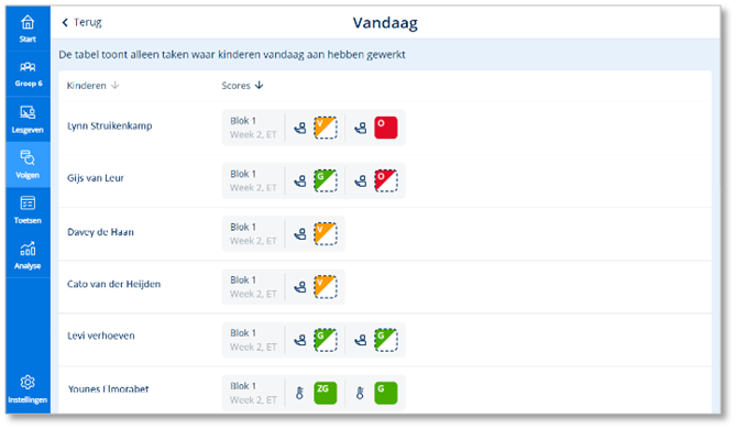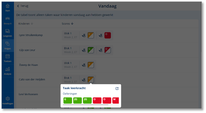 Naast de optie Basistaken en Eigen taken kun je ook kiezen voor Vandaag. Hier zie je de taken waaraan de kinderen deze dag hebben gewerkt. Let wel op dat elk kind andere taken krijgt in een adaptief systeem dus onderling vergelijken gaat niet zo makkelijk.